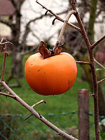 The slowly growing Kaki-tree becomes up to 15m tall, has round to elliptic, green shining leaves and has unspectacular green-yellow blooms. Its fruits have the size of tomatoes or apples; the leaves begin get luminous yellow to red colours in autumn before they fall off.