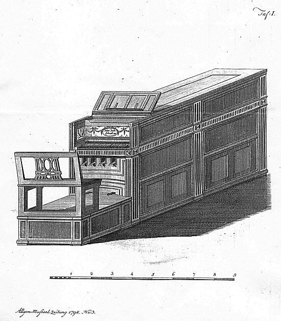 Dieß geschahe im Jahre 1789. Was die äußere Form desselben betrifft, so wird man sich aus der sehr pünktlichen Zeichnung desselben, die wir diesen Blättern beyfügen, eine ziemlich deutliche Vorstellung davon machen können. Seine Länge beträgt 7 Fuß, die Höhe 4½, und das Fußgestell 2 Fuß nach dem französischen Maasstabe. So einfach das Aeußere desselben ist, so kostbar ist es, indem alles an demselben, selbst die Bank nicht ausgenommen, beynahe auf eine verschwenderische Art von Mahagonyholz gearbeitet ist. Die untere Tastatur, die fünf Octaven im Umfange hat, ist von Elfenbein, die obere aber von Ebenholz.