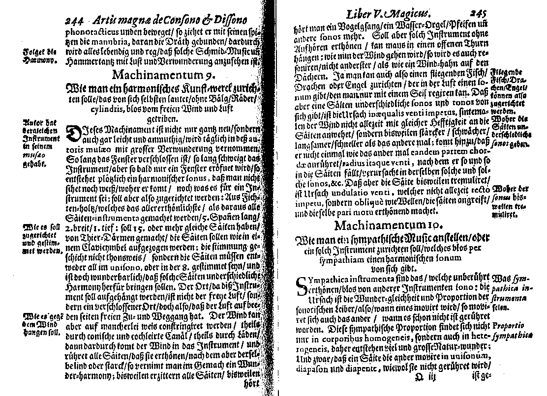 "Aeolium Instrumentum, quod sine ullo humano contractu, solo fortioris venti impulsu chordas radentis, adeo admirabile soni genus efficit, ut sola naturae industria auditores in stuporem det. Namque hi mox campanarum clangorem e longinquo se percipere autumant, mox videntur ex sufflatu organi tibias cantantes audire: dubiique haerent, an experti cijusdam tubicinis, Citharae dique ludentis jocos sonoros percipiant; asservatur in Musaeo Kircheriano. Ejus construendi rationem praescribit Auctor de Magia Phonotactica Machinam. 10. & in Phonurgia, hoc modo: Ex ligno tiliae resonantissimo, quibus fidicina instruments confici solent, instrumentum conficiatur 5. palmos longum, latum duos, profundum unum; hoc dein 15. chordis aequalibus ex animalium intestinis vel etiam pluribus paucioribusque instruatur. Porro modus concordantiae sit non per tertias aut secundas, sed debent omnes chordae in unisono, aut per octavas unisonae, aut omnes in uno tono concordes esse. Modus applicationis talis sit, ut, ubi ventus spirare maxime solet, per strictissimam rimam valvularum aut portarum cogatur transire, cui rimae retroponatur instrumentum, ut necessario ventus chordas radat. Auctor tunc absque ulteriori dispendio fenestras aperit, atque valvis fenestrae semipalmari spatio apertis, quaeis Aeolium Instrumentum insertum, adeo insolitum harmoniae genus exhibet solius venti impetu, ut nemo, ne conjectura quidem assequi possit. vide quoque Musurgiam Auctoris, &Georg. de Sepibus in Collegii Romani Societas Jesu Musaeo p.51. Ibidem Magnes est Aeolius, piscis volans, quam laquearia designans. Pilae item Aeoliae, &c.p4."