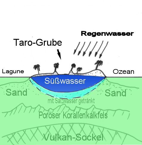 Es gibt im Inneren dieser Inseln eine sogenannte Süßwasser-Linse. Diese hat tatsächlich annähernd Linsengestalt, wird von oben durch Niederschläge erhalten und von unten bzw. von den Seiten durch Meerwasser "angeriffen" - und bei Überschwemmung (Tsunamis, Stürme) sogar durch das salzige Meerwasser so stark "verunreinigt", daß sie für einige Zeit nur Brackwasser "liefert". Das hat zur Folge, daß die Früchte beispielsweise der ebenfalls auf Süßwasser angewiesenen Brotfruchtbäume schleunigst abgeerntet werden müssen, weil die Bäume ihre Blätter und Früchte bei solcher Gelegenheit rasch abwerfen oder gar ganz zugrunde gehen können...