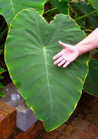 Größenvergleich zwischen einem Taro-Blatt und einer Hand